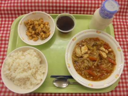 献立 麦入りご飯 家常豆腐 牛乳 ぎすけ煮 ぶどうゼリー 今日は、家常豆腐とぎすけ煮です。大豆で作られた生揚げと乾燥大豆を水でもどしてデンプンをまぶし揚げたもので、大豆を加工した食品です。このように、いろいろな形になった大豆が、日本の食卓で食べられています。ほかに何があるか考えてみましょう。