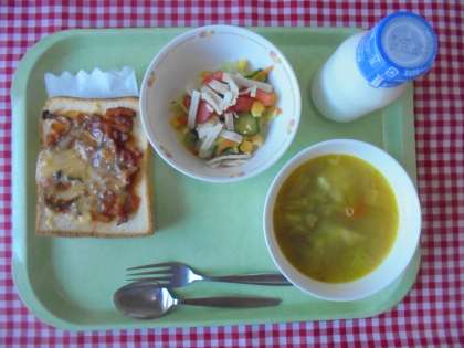 献立 ピザトースト 牛乳                             カレースープ 和風トマトサラダ                                                                 今日はブックメニューの日です。小さなおばけのアッチはレストランの屋根裏に住んでいます。おばけが出ると噂が広まりお客さんが減ったレストラン。店を救う為アッチは良いことを思いつきます。さて、ピザパイくん助けてよとかけた願いは、叶うのでしょうか。アッチの応援をするため給食でもピザトーストを焼きあげました。皆さんも残さず食べてアッチを応援しましょう                           産地 たまねぎ(北海道)ピーマン(宮崎)ブナシメジ(長野)ニンジン(千葉)じゃがいも(北海道)キャベツ(愛知)きゅうり(群馬)