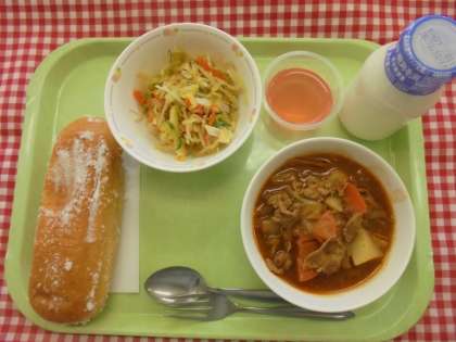 献立 さとう揚げパン ボルシチ 牛乳                       糸寒天の中華風サラダ アセロラぜりー                                                              今日は、ボルシチについてのお話です。ボルシチは、世界の三大スープにあがるほど有名なロシアのスープです。テーブルビートと玉ねぎ、ニンジン、キャベツ、肉などを炒めてから、スープでじっくり煮込んでつくります。しかし、ビートが手に入らない地域では、トマトを代用して具だくさんでオレンジ色のスープをボルシチと呼んでいます。