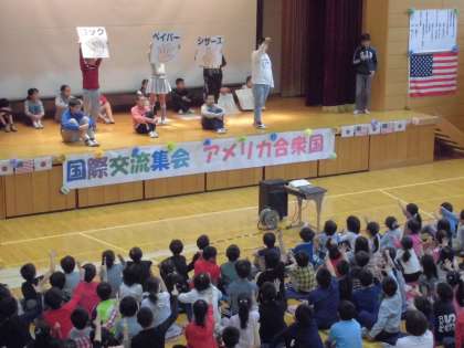 今年の国際交流集会では、日本語学級で学習している児童が、アメリカ合衆国の小学校生活や食べ物、自然や文化などについて発表しました。アメリカの遊びを紹介し、全校児童が「じゃんけん」や「サイモンセッズ」をやって楽しみました。池袋小学校には、いろいろな国の友達がいて楽しいです。それが、池袋小学校のいいところです。