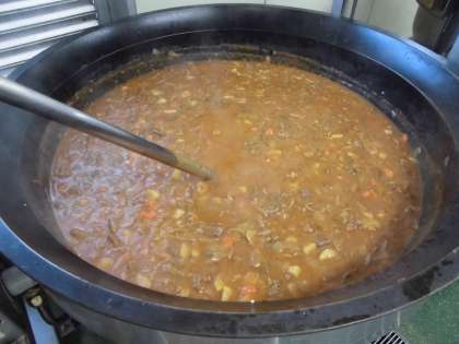 2枚目 お肉を炒めた後に、野菜と肉も入れて炒めています。300人分一度に炒めるのは力のいる作業です。