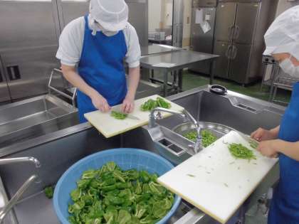 今日は、ピーマンや他の具材を、油で炒めて、チンジャオロースにしました。左の写真は、ピーマンを千切りにしているところです。全校分で12kgのピーマンを切りました。