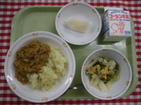 ごぼう入りドライカレー パリパリサラダ 梨 牛乳 今日の給食ひとく...