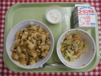 マーボー豆腐丼 中華風サラダ みかん入り牛乳かん 牛乳 今月の栄養目標は、「赤色...