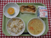 コーンライス さかなのチーズ焼き(魚はホキです。) トマトとたまごのスープ 青切...