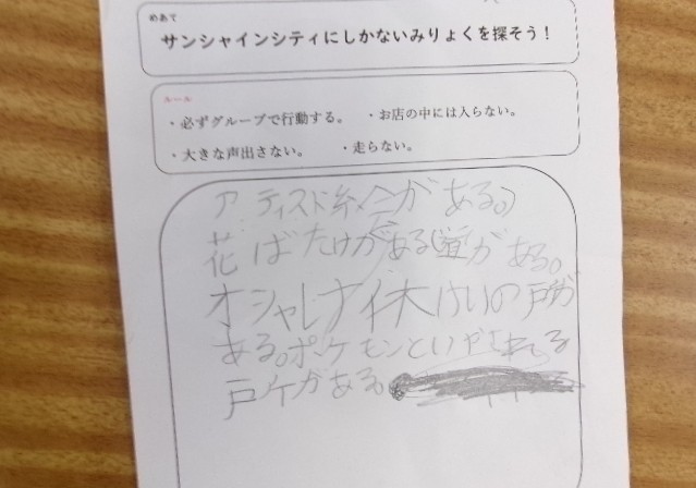 地域学習を進めている3年生は、学級ごとにテーマが異なります。今日は1組がサンシャインの魅力を見つけるため、サンシャインに見学に行きました。そして学級で見つけたことのまとめを行いました。