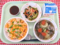 にんじんごはん・さつま芋と南瓜のグラタン・白菜とベーコンのスープ・ツナ入りサラダ・牛乳