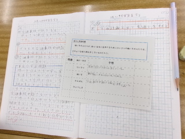 社会科で「地域の安全を守る」ということをテーマに、自分たちの安全がどのように守られているのかを出し合いました。