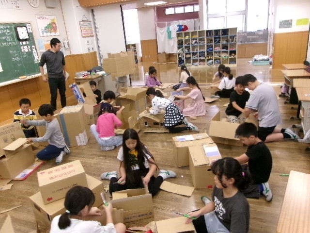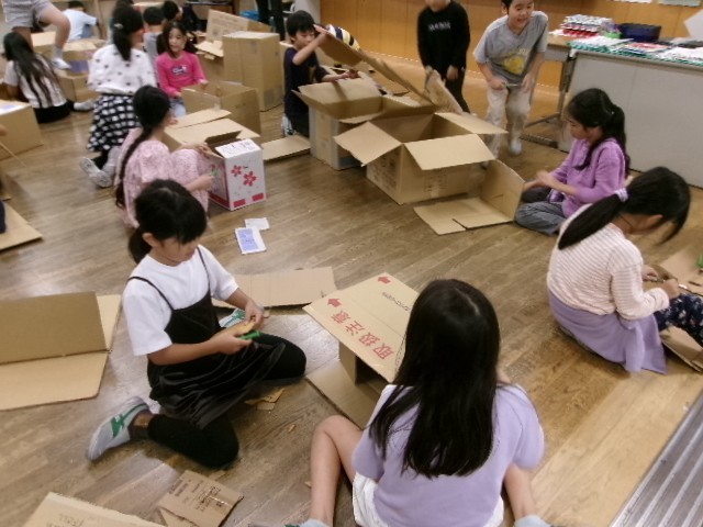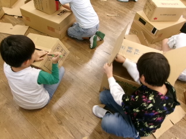 段ボールを組み合わせての表現活動です。切って、はめ合わせて、つなげて・・・思い思いのイメージで楽しい作品が出来上がることでしょう。