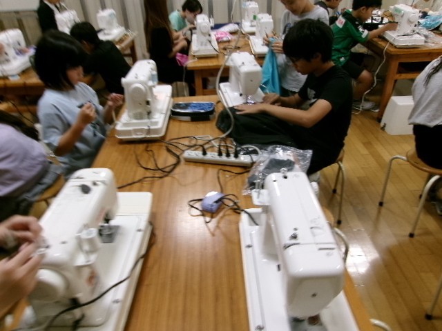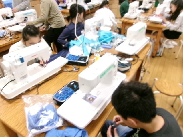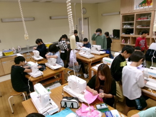 家庭科の時間、ミシンを使ってエプロン制作に取り組んでいます。一人1台でどの子も集中して頑張っています。