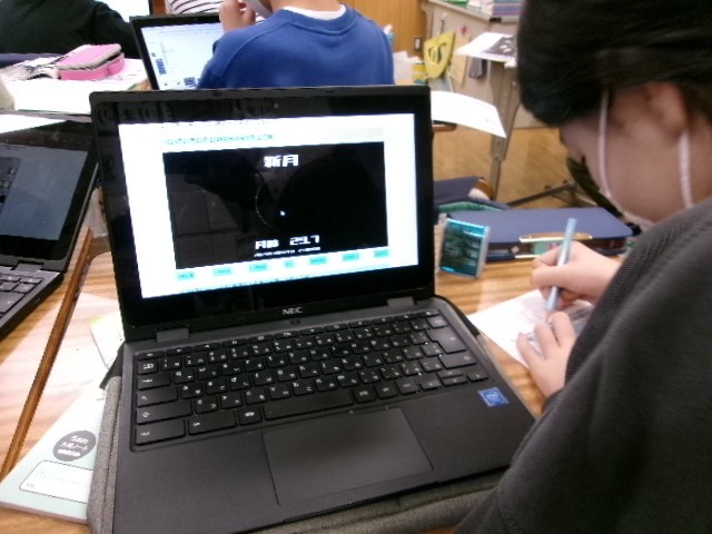 月の変化について、タブレットで調べながら、「〇月〇日の月の形は?」などとノートにまとめていきました。
