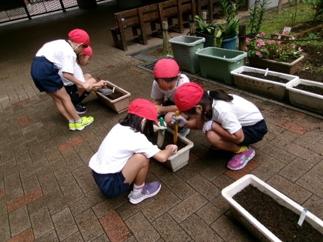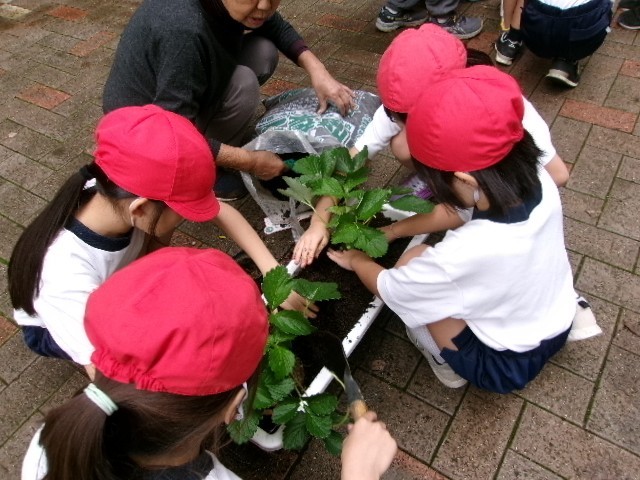 自分たちで計画してきた野菜や果物を植えました。写真はイチゴの苗を植えている様子です。