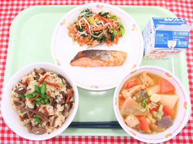 金平ごはん・ますの西京焼き・根菜のごまみそ汁・しらす入り野菜のおかかあえ・牛乳