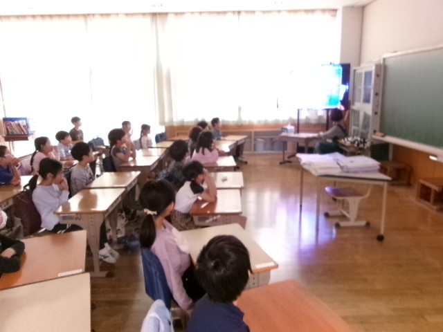 学校司書さんが教室のモニターで映し出しながら、絵本の読み聞かせをしてくださいます。子供たちは読み聞かせが大好きです。