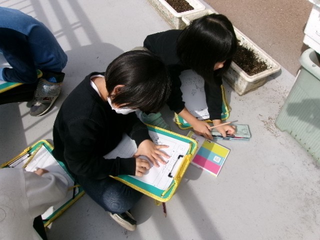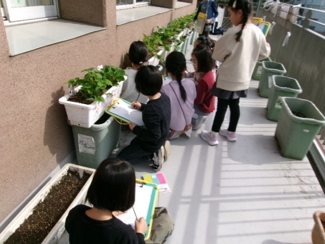 先日植えた冬野菜などの観察会です。自分で見たものを記録しながら、「こんなに大きくなってる」と声を上げています。