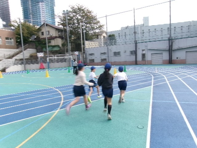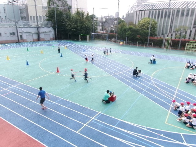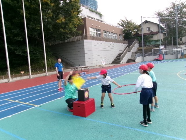 運動会の団体競技の練習です。3色に分かれ、偶然性もあり、チームワークも必要と、なかなか楽しい競技です。