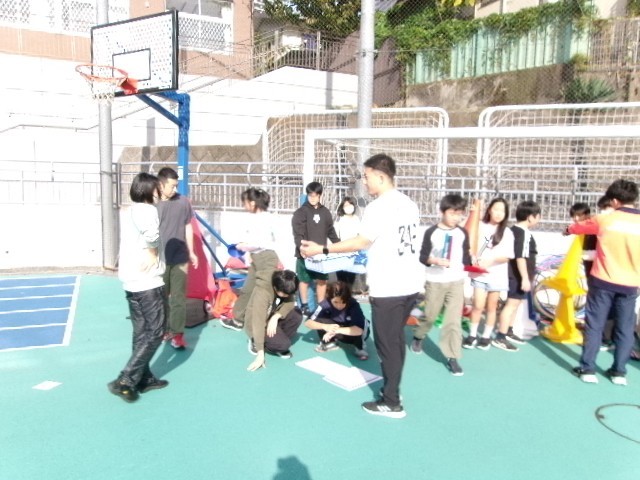明日の運動会に向けての会場準備を6年生の力を借りて行いました。よく動く6年生です!