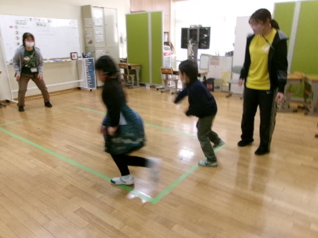 大きなボールに当たらないように体を操作しながら、ボールを避けていきます。友達とも声を掛け合いながら取り組みます。