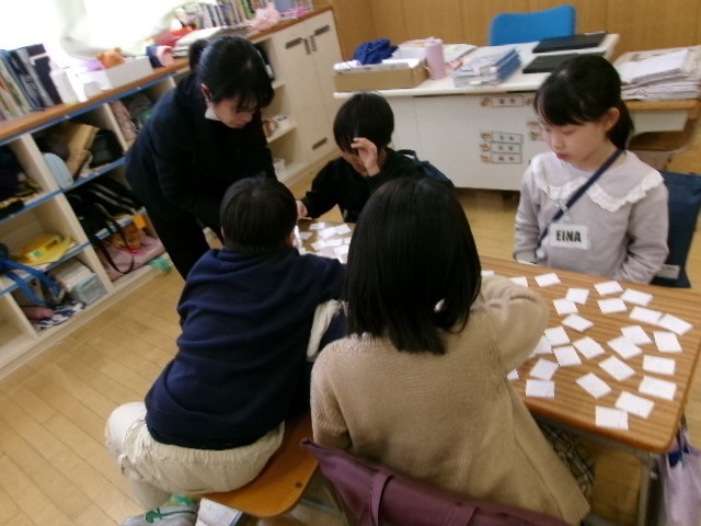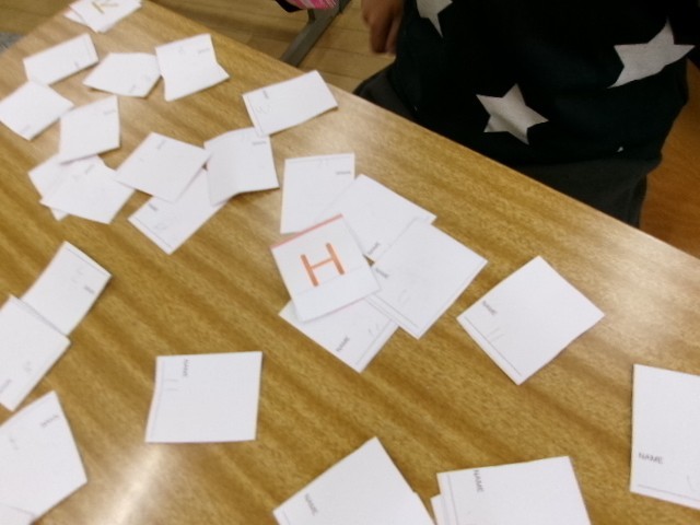 英語の時間、アルファベットが書かれているカードを使って神経衰弱ゲームです。出たアルファベットを言葉にしてゲームを進めていきます。