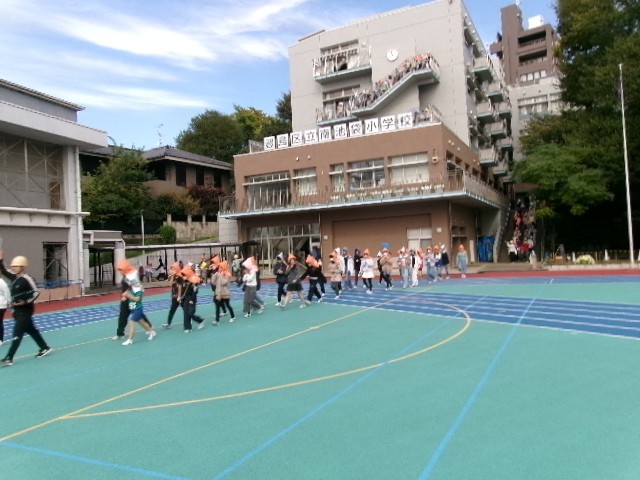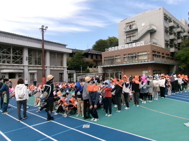 近隣住宅からの出火を想定しての避難訓練です。まずは校庭に避難しました。