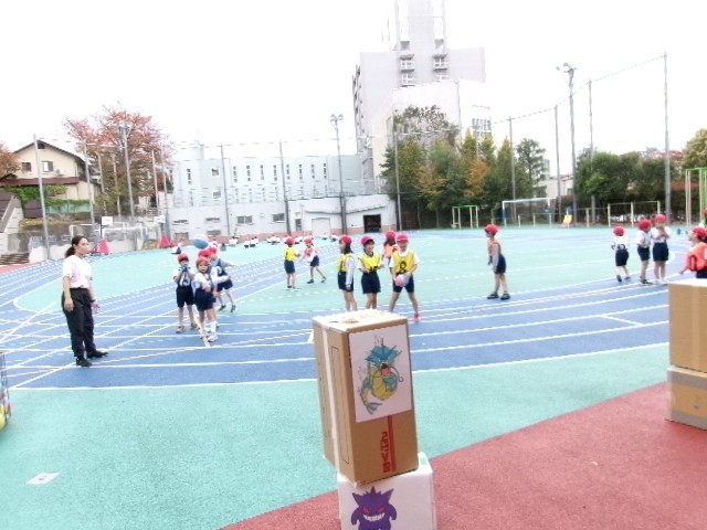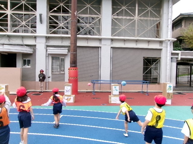 体育の時間、段ボールにキャラクターの絵をはって、的当てに挑戦しました。「ポケモンゲットだぜ!」と大喜びの子供たちです。