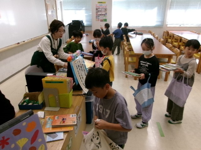 図書館司書さんによる読み聞かせです。毎回、子供たちの心が温かくなります。読み聞かせの後は、図書室に行って好きな本を探します。