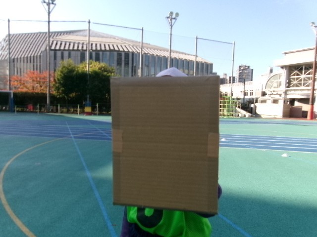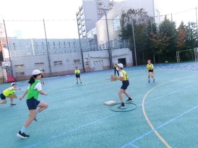 中学校のソフトボールにもつながるルールで、ベースボール型の学習に取り組みます。グローブの代わりに、ボールが当たればキャッチとみなす手作りボードを使っています。
