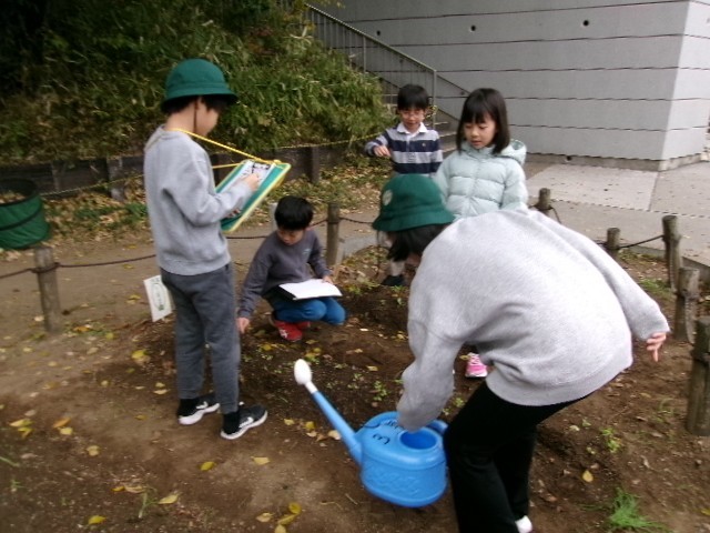 先日植え替えを行った冬の野菜などのお世話と観察を、地域の人と一緒に行いました。