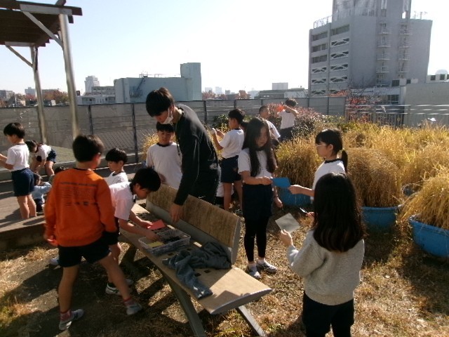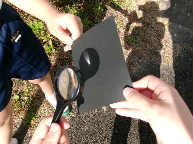 太陽の光をルーペで集め、色画用紙に当てて、その様子を体験的に確かめていきます。子供たちも生き生きと活動しています。