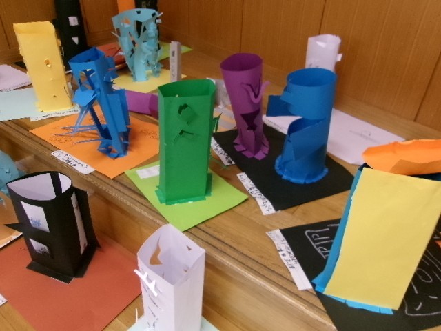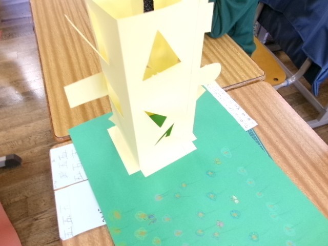 2年生の図工「まどをあけたら」です・カッターを使い、建物の窓を作って、作品に仕上げていきます。