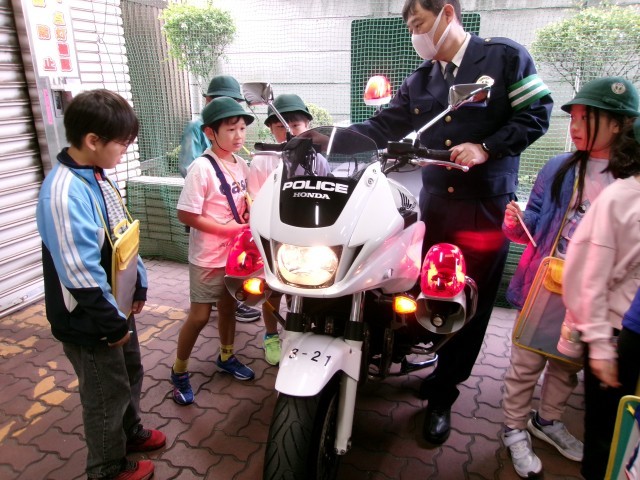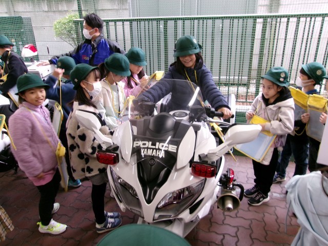 2つめの見学ゾーンは白バイです。めったに間近ではみることも触ることも乗ることもできないので、貴重な経験です。