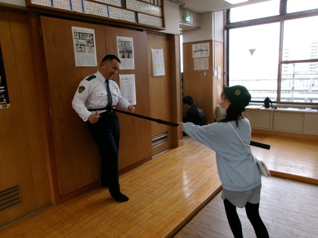 3つ目は道場に行き、警察官が身に付けている装着品を紹介してもらいました。また、実施に着たり触ったりして、警察官が安全に仕事ができている工夫や秘密を知ることができました。