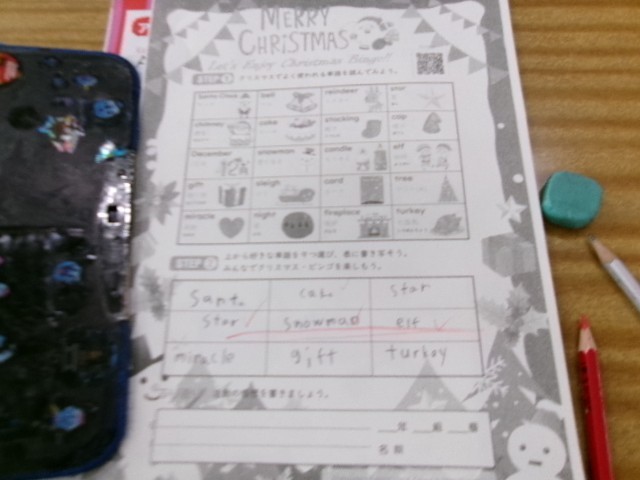 クリスマスの単語を使ったビンゴゲームを通して、英単語を知り、覚えていきます。