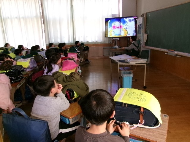 学校司書さんによる読み聞かせです。夢中になって聞いている1年生です。