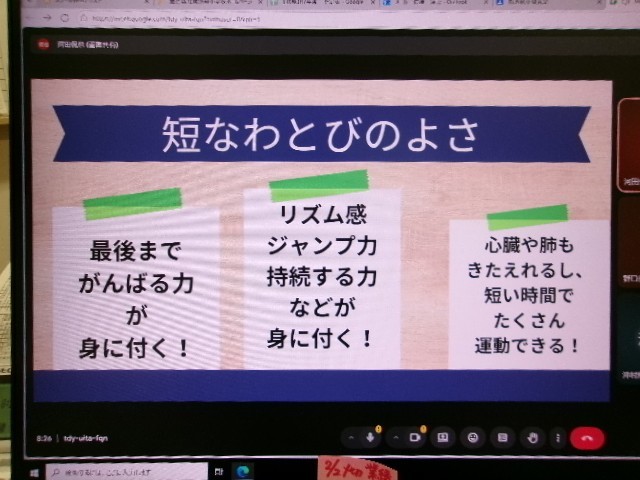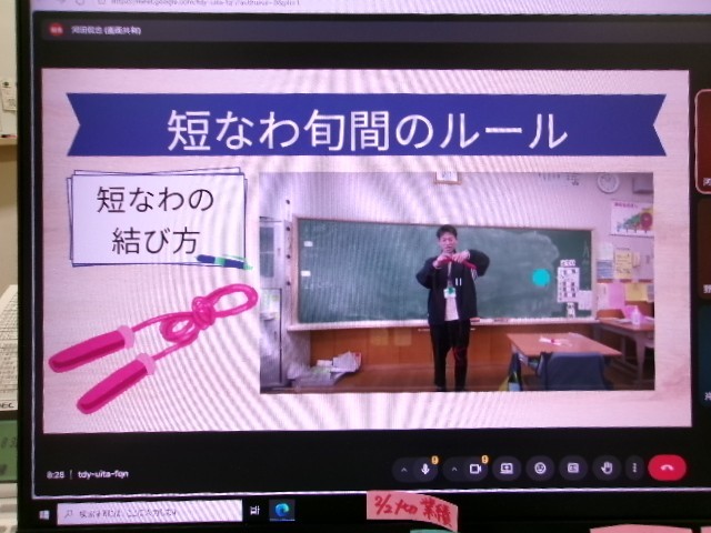 今朝はオンラインでの体育朝会が行われました。今日から短なわ旬間が始まるので、その取り組み方などについての説明がありました。休み時間などにたくさんの頑張りがみられることを期待しています。