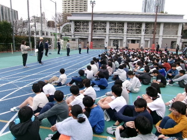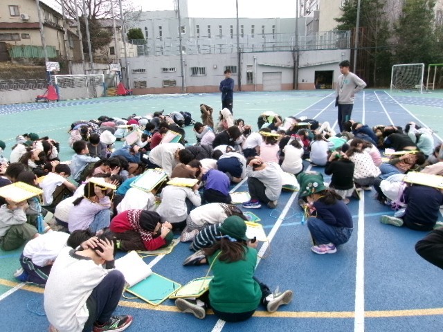 休み時間に地震が起こった設定での避難訓練です。今日は子供たちには予告なしで行われました。少しお話し声が聞こえていましたが、よく頑張りました。