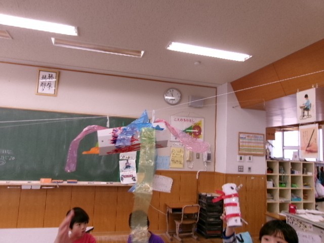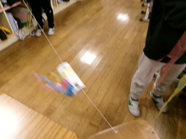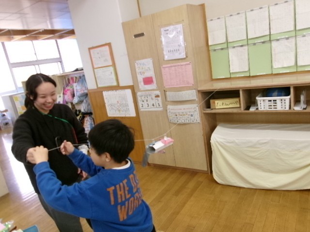 スルスルビューンという単元で、子供たちが楽しく制作活動を行いました。糸に引っ掛けて動かすおもちゃ作りに、子供たちがはまっています。