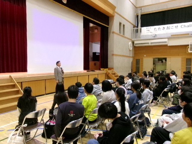 6年生が千登世橋中学校を訪問し、中学校体験を行いました。はじめは全体会で高南小学校、目白小学校の6年生と一緒に、生徒会の作成したウェルカムビデオを視聴したり、中学校の校長から話を聞いたりしました。校長からは「中学生になったら大人扱いをする。なんでも自分でできるようにすること、結果ではなく努力できる人になること」などの話がありました。