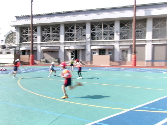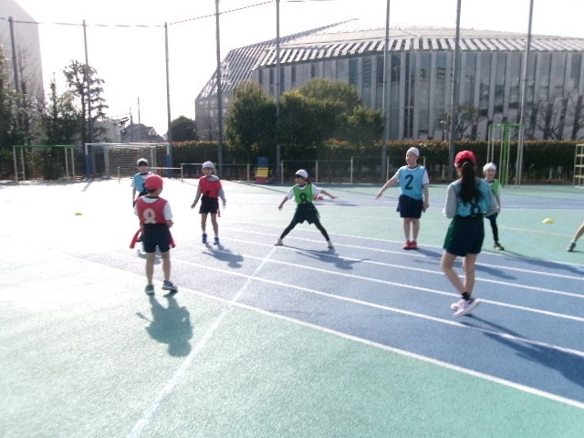 フラッグフットボールの前段階の運動として、ボールを宝に見立ててたから運び鬼のようなゲームで体をほぐします。とは言え、運動量はたっぷりです。