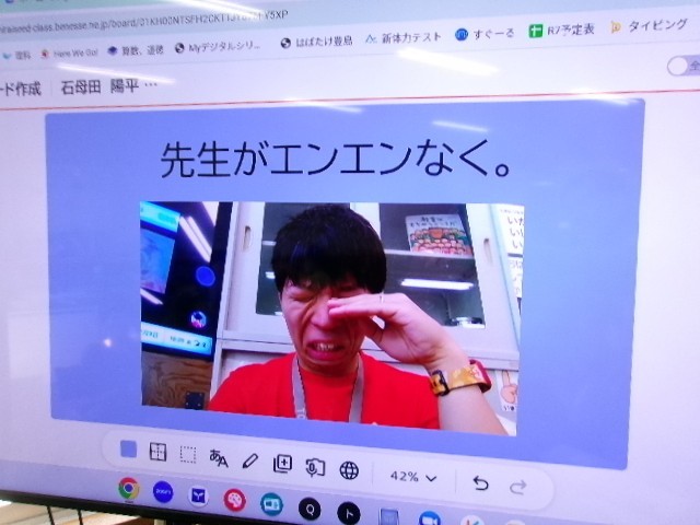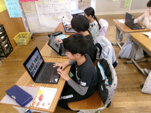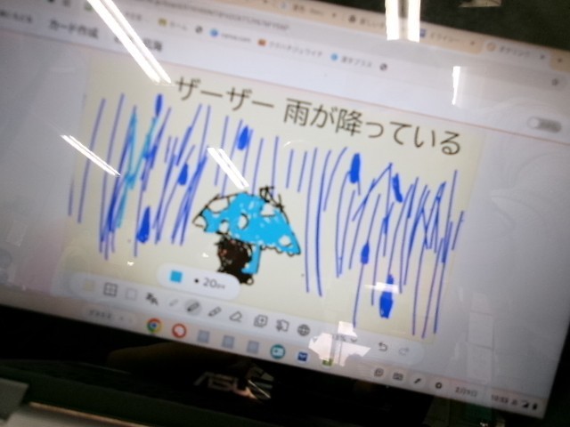「先生がエンエンなく。」など、様子を表す言葉を考えていく学習です。子供たちはタブレット使って楽しそうに集めた言葉を表していました。