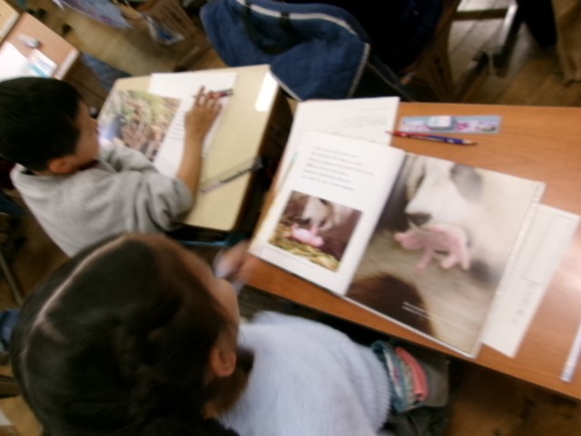 説明文の「どうぶつの赤ちゃん」の学習に区切りをつけ、今度は自分の関心のある動物を調べ、説明文で身に付けた表現方法で文章にまとめていく学習です。みんな興味津々です。