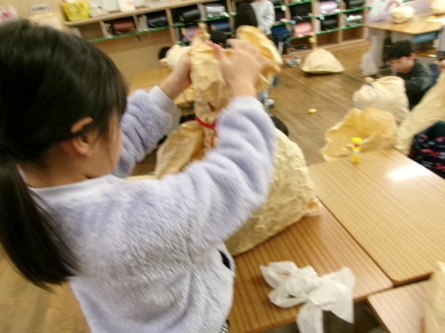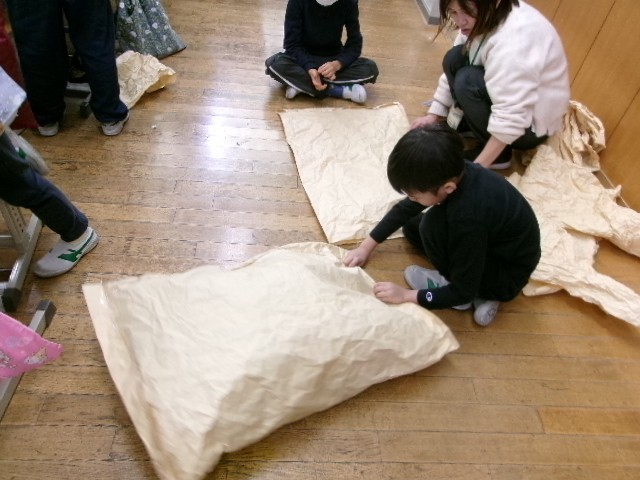 新聞紙を大きな紙で包み、「ぎゅっとしたい自分の友達を作る」ことをめあてにして活動しました。