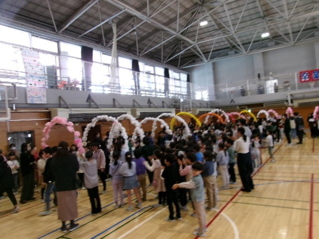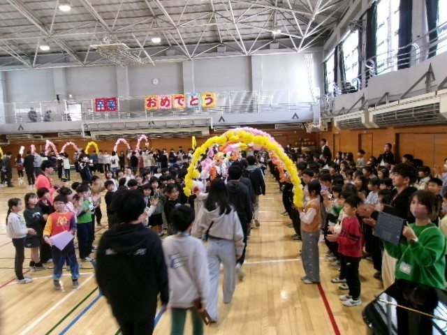 全校合唱、終わりの言葉で会が終わり、6年生が花のアーチをくぐって退場していきました。心に残る、素晴らしい6年生を送る会となりました。企画運営を進めた代表委員会の子供たちも素晴らしかったです。