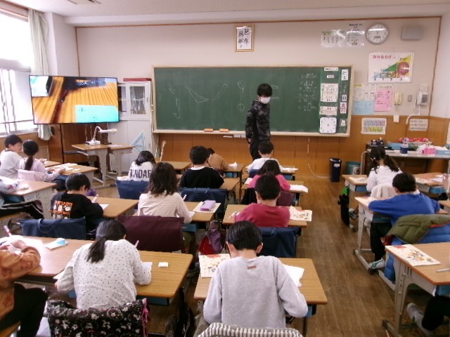 3年生になると習字が始まりますが、ちょっと先取りして、水筆を使って自分の名前を書く活動にチャレンジしました。5年生の担任の先生が水筆の使い方などを教えてくれました。