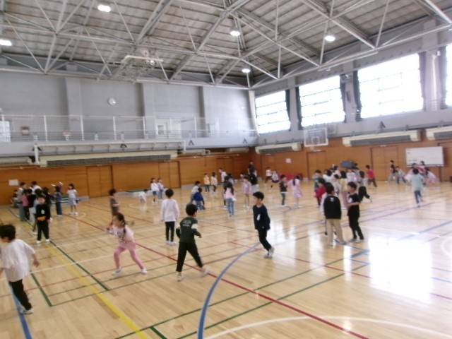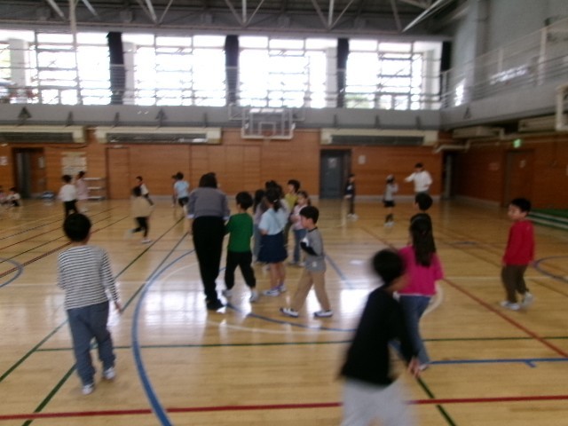 休み時間に初めて体育館を使って遊びました。広い体育館でとっても楽しそうです。