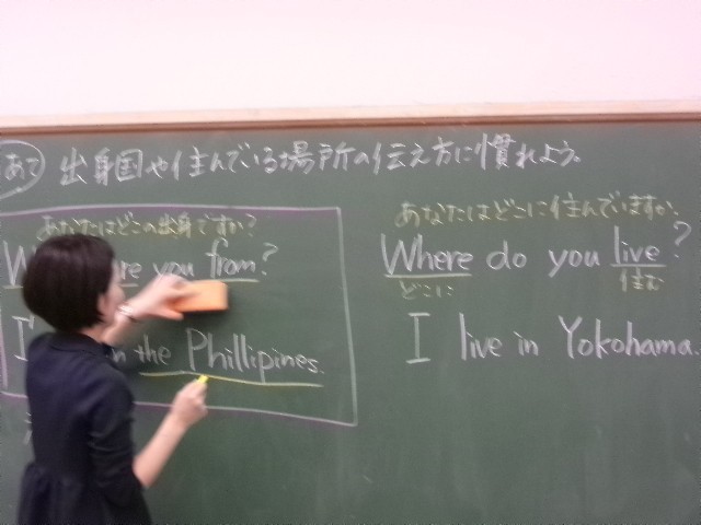 英語で出身国や住んでいる場所の伝え方を学びました。繰り返し発音しながら練習に取り組みました。