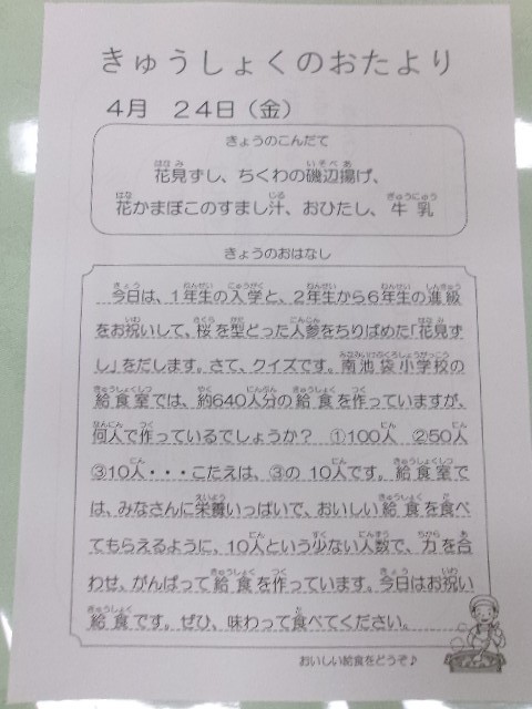 明日の「1年生を迎える会」のタイミングで、今日は「花見寿司」が給食に出され、お祝いムードを盛り上げました。いつもおいしい本校の給食です。