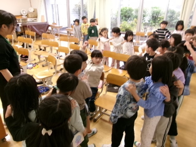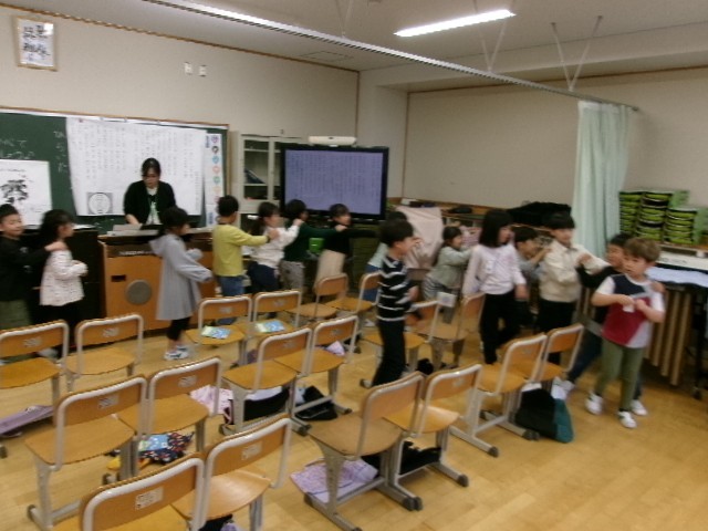 1年生が校歌を覚える練習をしています。その流れの中で、校歌をBGMにしてじゃんけん列車にも取り組みました。