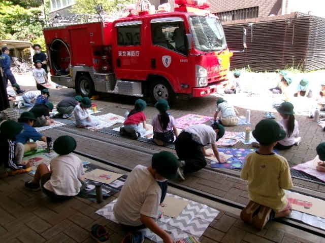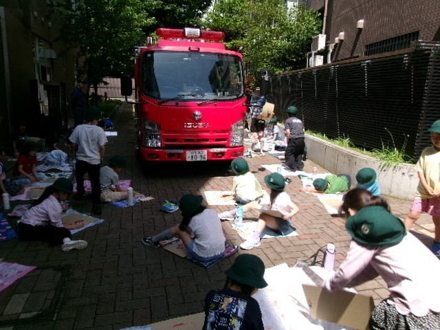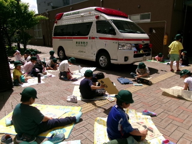 消防車や救急車を、画用紙いっぱいに思い思いに描きます。天気も良くて、気持ちもよいです。