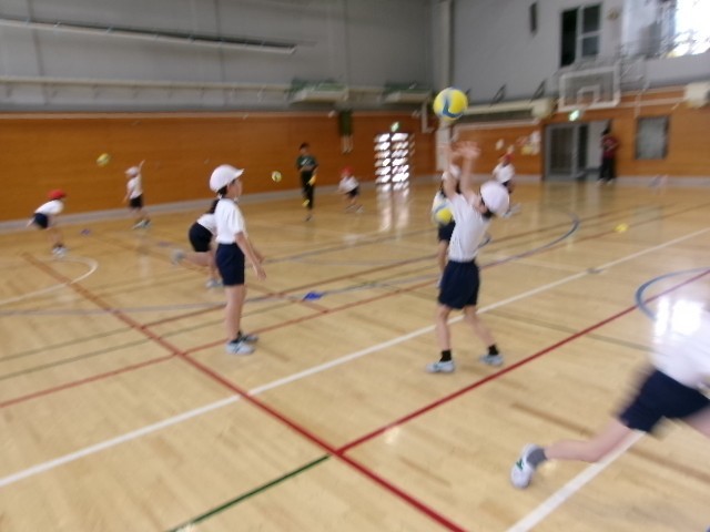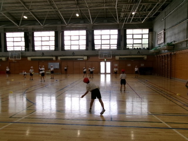 3年生はプレルボールというゲーム学習が始まります。ボールを叩いて相手コートに入れながら得点を競い合うゲームです。今日は初めてなので、ボールの扱いから始まりました。